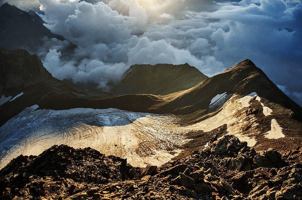 GHIACCIAIO CHAALATI DALLA VETTA DEL MONTE LASHKDILAR, CAUCASO, GEORGIA - Aprile