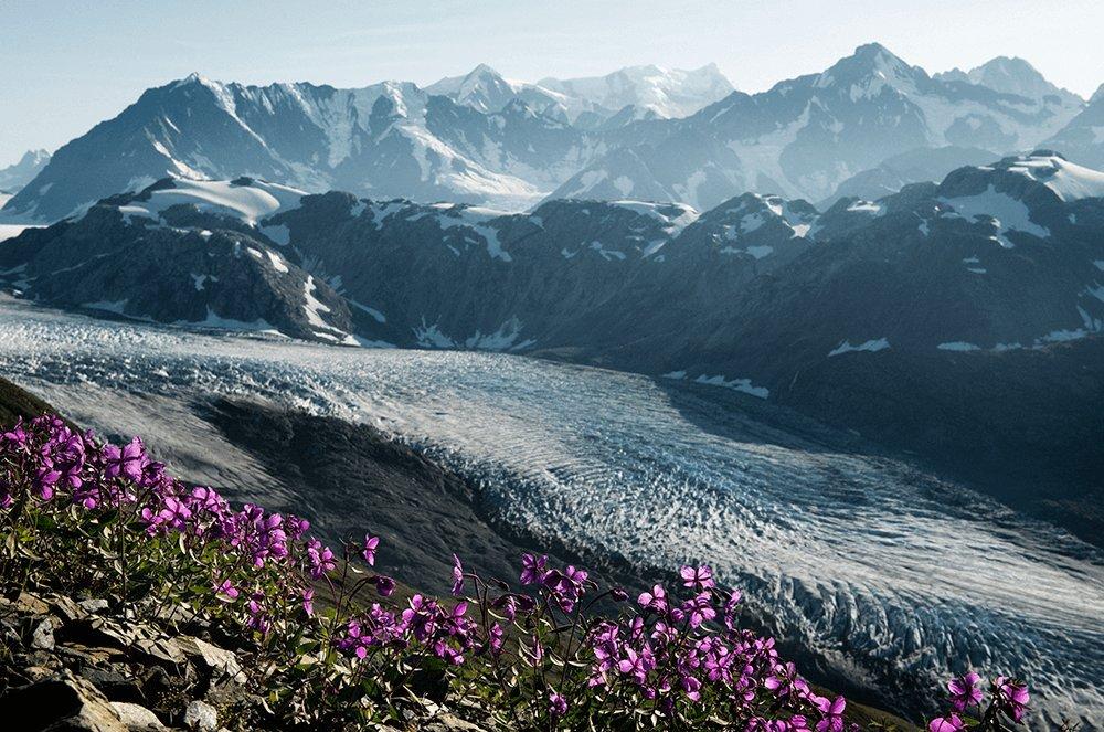 Il Reid Glacier, tormentato dall’intrico dei crepacci, scende verso la Glacier Bay. È solo una delle numerose lingue che si dipartono radialmente dal gigantesco icefield, l’altopiano glaciale compreso fra le acque strette fra i fiordi della Glacier Bay e quelle libere del Golfo dell’Alaska nell’Oceano Pacifico. Morene antiche e rocce recentemente liberate dal ghiaccio ne segnano il cammino, insieme alla sfilata di cime spesso senza nome che chiudono l’orizzonte. È però la vegetazione pioniera in primo piano che cattura l’attenzione: il viola squillante dei petali in un mondo unicamente minerale sottolinea le capacità della vita di riappropriarsi dello spazio lasciato libero dal ghiaccio.