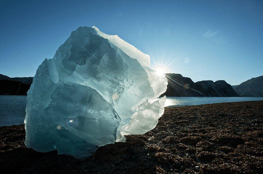 Una spiaggia sulla Glacier Bay, in Alaska, nel parco nazionale omonimo. Nella regione, che fino a due secoli fa era coperta da ben più vaste superfici glaciali, i ghiacciai stanno arretrando con ritmi incredibili, anche 15 km in un secolo. In questa zona infatti gli effetti dei cambiamenti climatici sono amplificati dalla particolare situazione geografica; molti ghiacciai sfociano nell’oceano, le cui caratteristiche di temperatura e di salinità, la presenza di correnti, la morfologia dei fondali, condizionano pesantemente l’evoluzione delle lingue glaciali. Solo un blocco di ghiaccio dai grandi cristalli trasparenti, mestamente appoggiato sulla spiaggia ghiaiosa, ricorda gli antichi fasti della Piccola Età Glaciale.