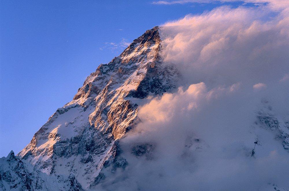 Il K2 con il drappeggio di nuvole, sfrangiate dai turbolenti venti occidentali, che nascondono lo Sperone Abruzzi, dove per primi salirono esploratori e alpinisti italiani. Creste e pilastri sembrano quasi fumare nel furore della tormenta che ridistribuisce tonnellate e tonnellate di neve, contribuendo ad alimentare il Ghiacciaio Baltoro. Lo sperone centrale della “Magic Line”, scolpito dalle frane e dalle valanghe, alterna neve, ghiaccio, roccia: un mondo minerale in continua e sempre più rapida trasformazione.
