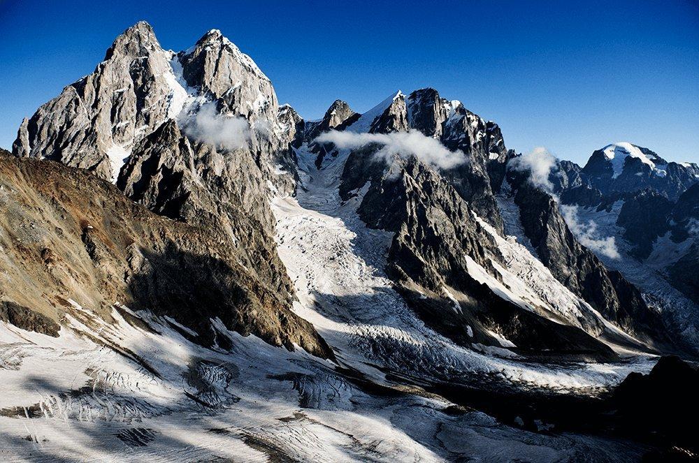 Dalla bifida cima del Monte Ushba, il “doppio Cervino del Caucaso”, scende la colata, segnata dai numerosi crepacci, che da ovest alimenta il tronco principale del Ghiacciaio Chaalati, appena visibile sulla destra. È un classico ghiacciaio vallivo composto, costituito cioè da numerose colate confluenti. I cambiamenti climatici recenti ne stanno però intaccando la struttura unitaria; la lingua principale è infatti arretrata di quasi 2 km dalla metà dell’Ottocento e diversi settori secondari si sono già separati.